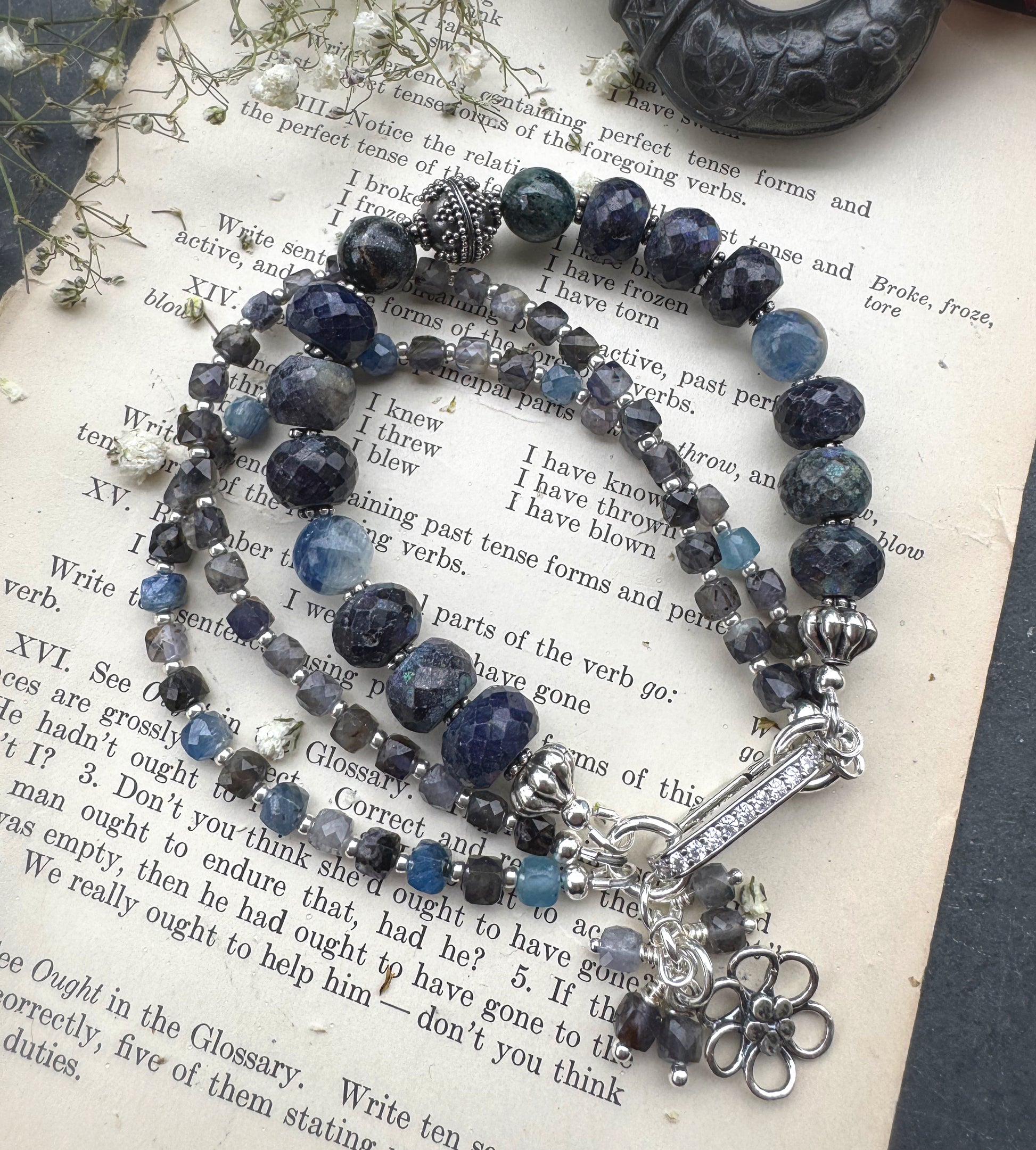 Iolite faceted rondelle beads, 9 mm with AB coating for extra sparkle and shine. With kyanite rounds and 8 mm. Mixed with 4 mm kyanite and iolite cube beads. Sterling silver flower charm and rhinestone carabiner clasp. Sterling silver and glass spacer beads