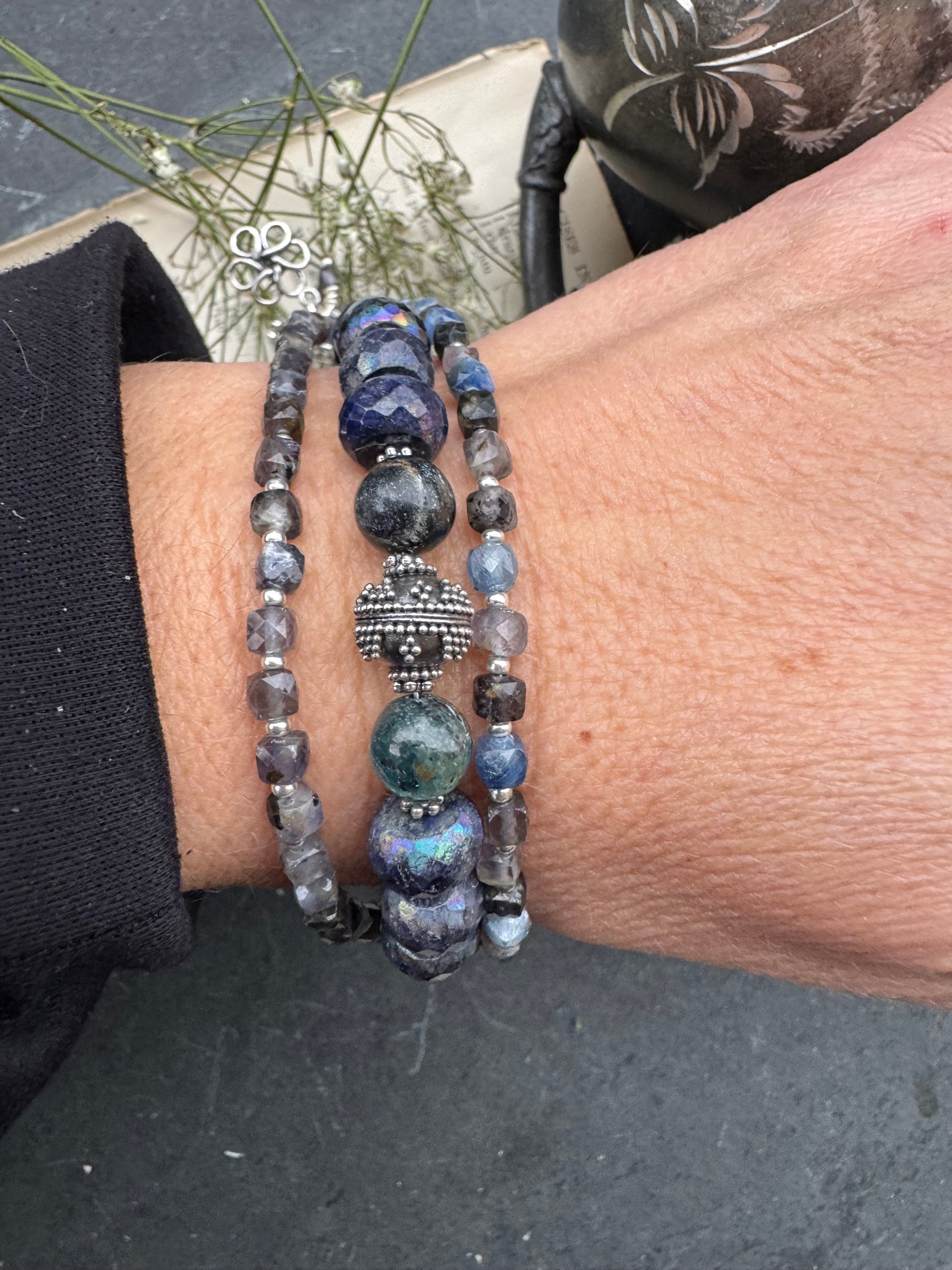 Iolite gemstone, kyanite gemstone and rhinestone, silver clasp, bracelet