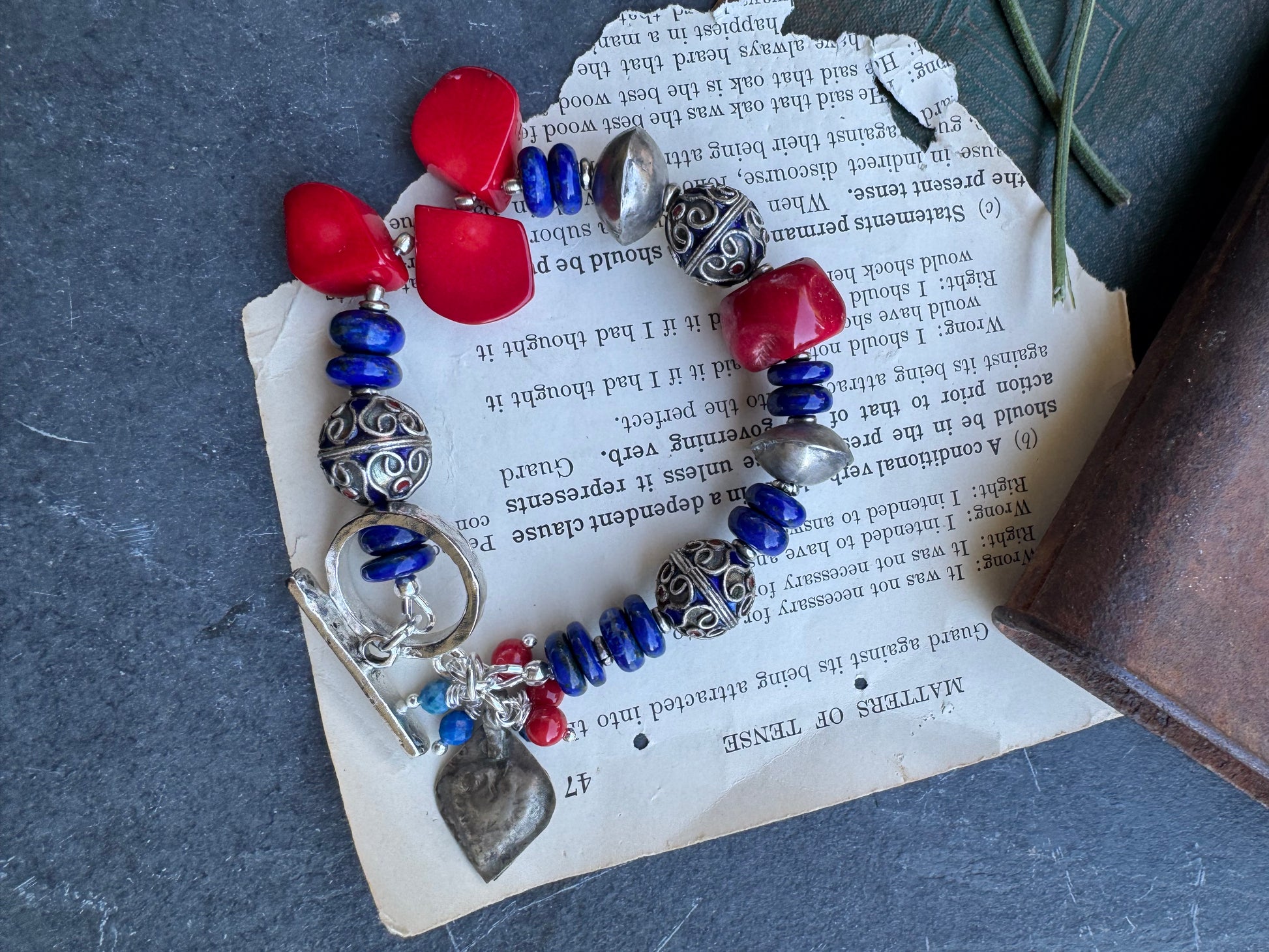Lapis lazuli stone, red coral, silver metal, bracelet