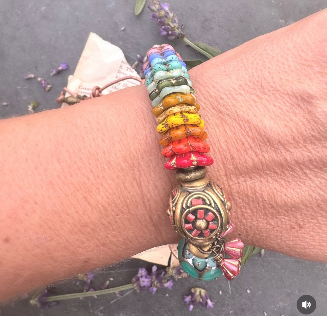 Lotus flower bronze button, Czech glass, Indonesian bead, bone, lampwork glass, African brass, bracelet