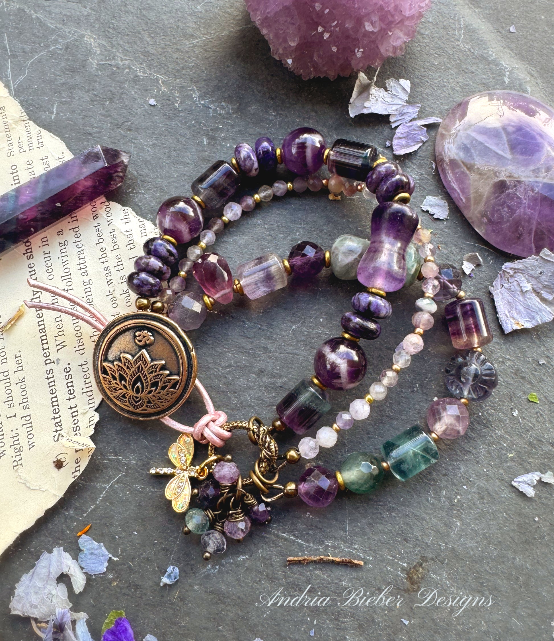 Lotus flower bronze button, fluorite stone, amethyst, sugalite, bracelet