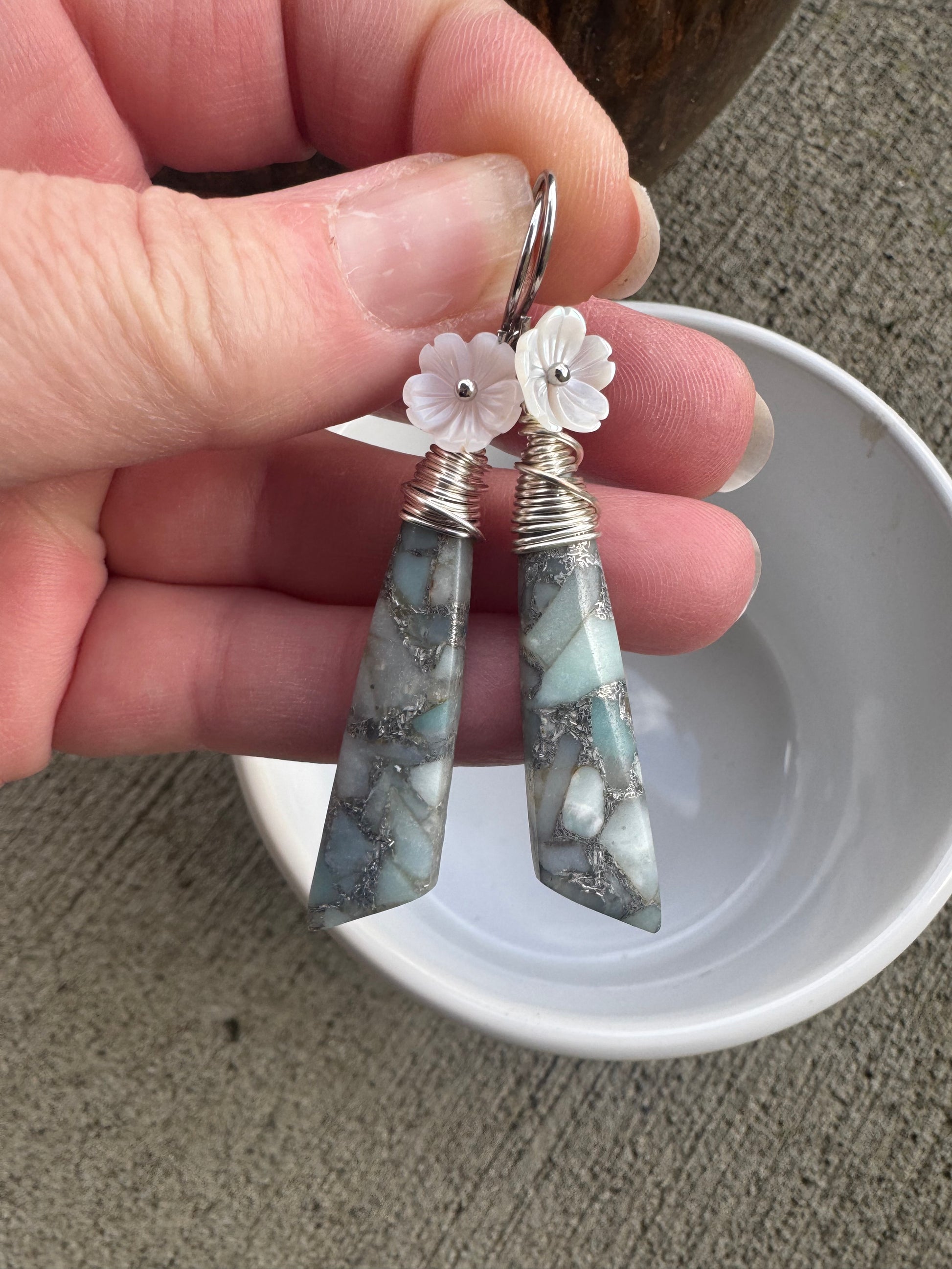 Mixed stones drops, white shell flowers, silver wire wrapping and sterling silver ear wires. Measuring 2.5 inches. are lightweight.