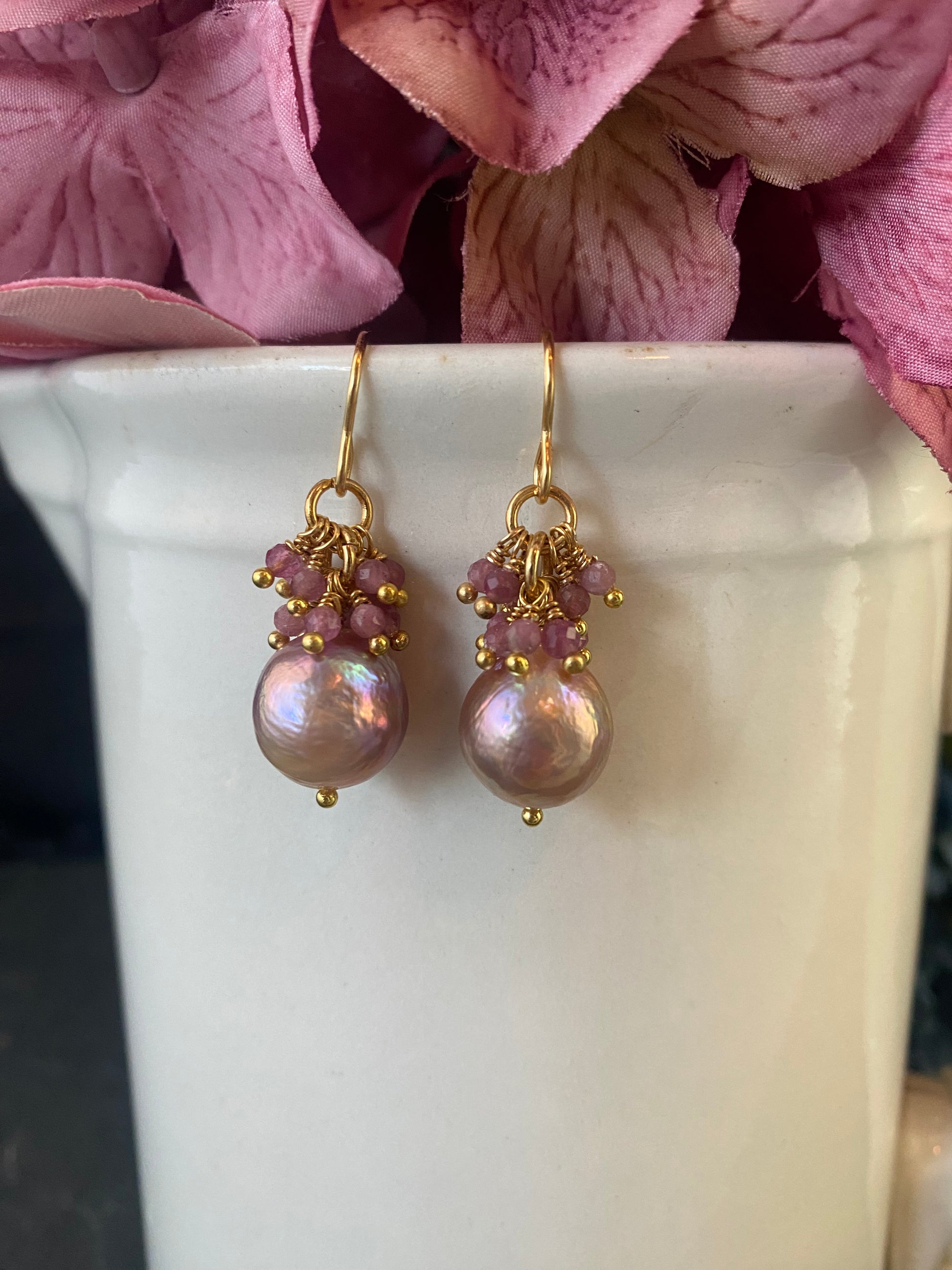Pink baroque pearls and pink tourmaline stone earrings. MTO.