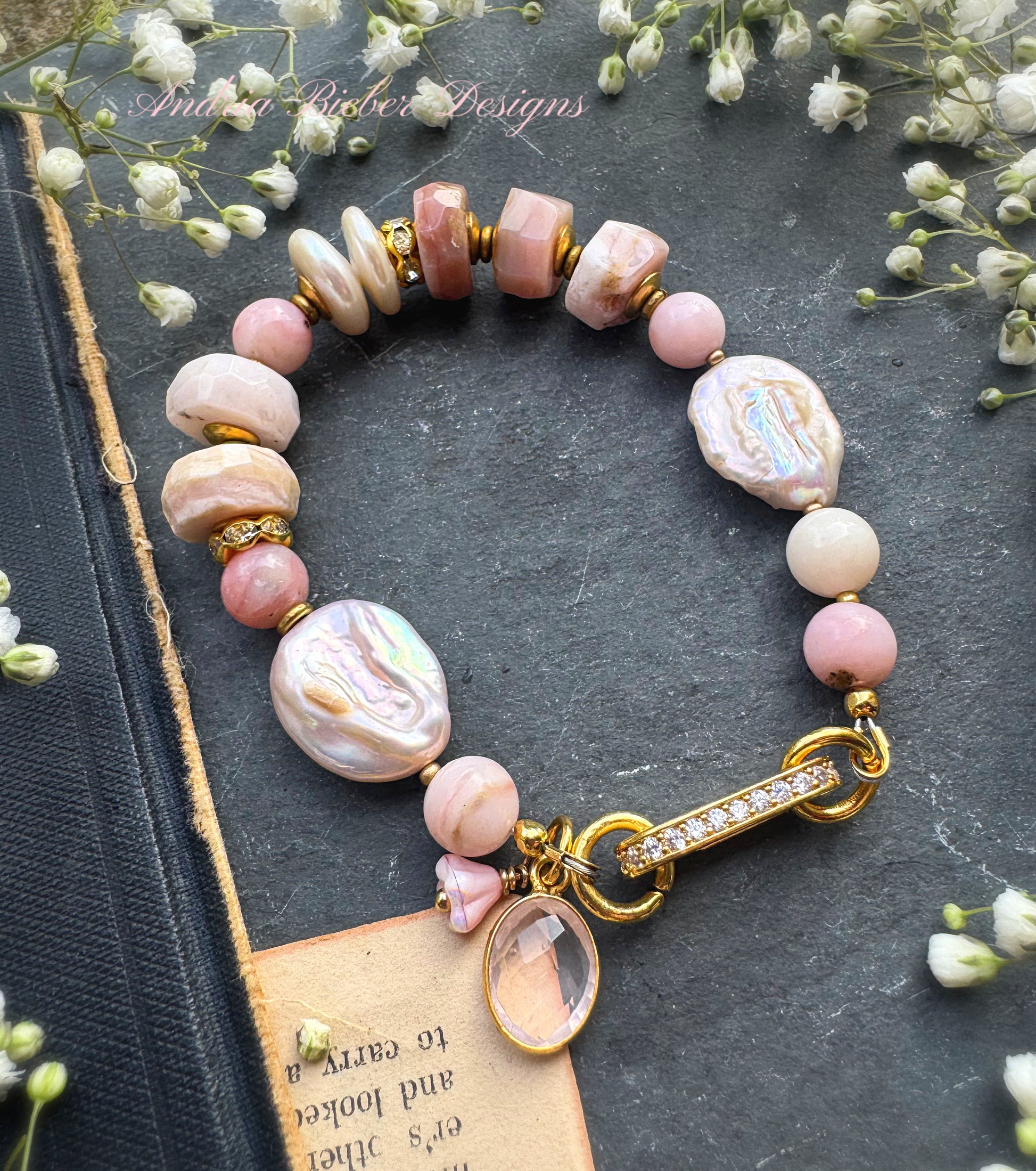 Pink opal, rose quartz, pearls, rhinestone clasp, bracelet.