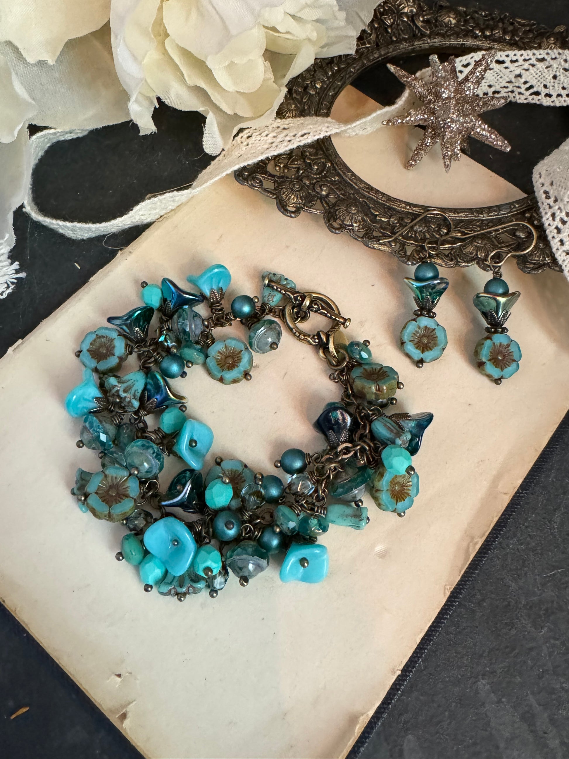 Teal flower bracelet. Czech glass, bronze metal bracelet. KIT