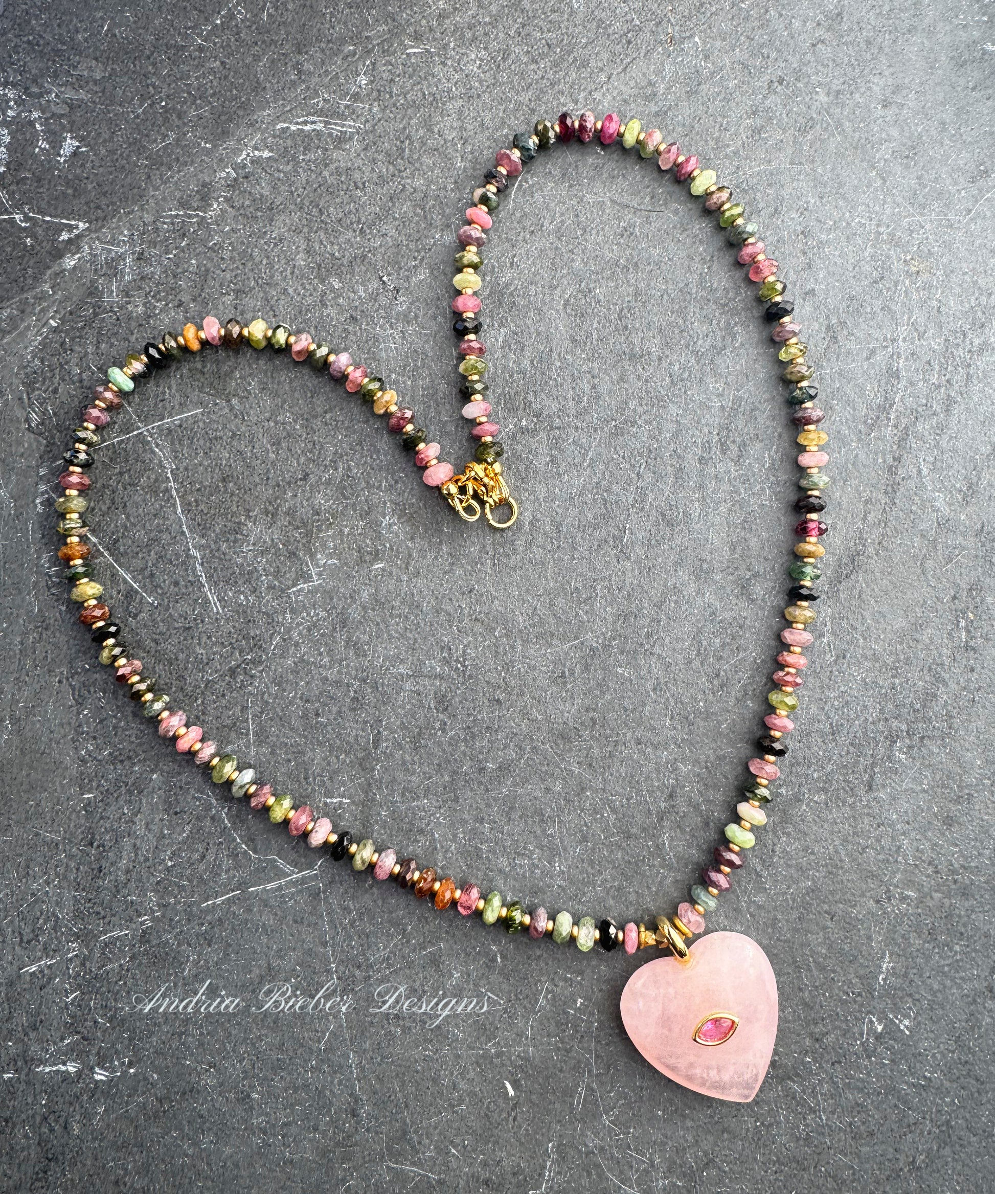 Watermelon tourmaline stone, Heart rose quartz pendant, gold metal, necklace