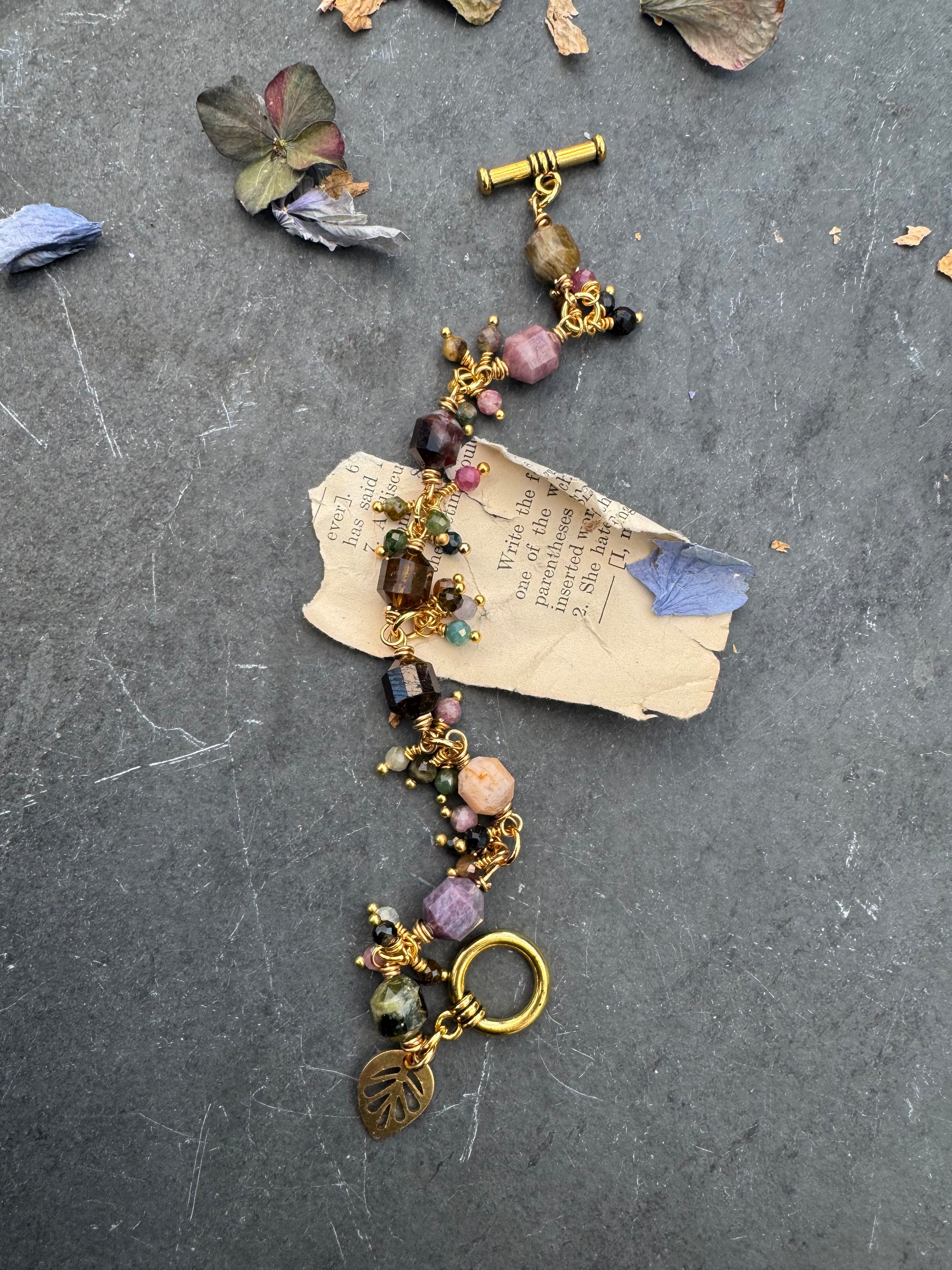this bracelet is made with red sapphire faceted round stones 8 mm in size, with Tourmaline Rondell stone in 4 mm. I wire wrapped each speed individually with a bronze head pin for added detail. Bronze chain and toggle clasp.